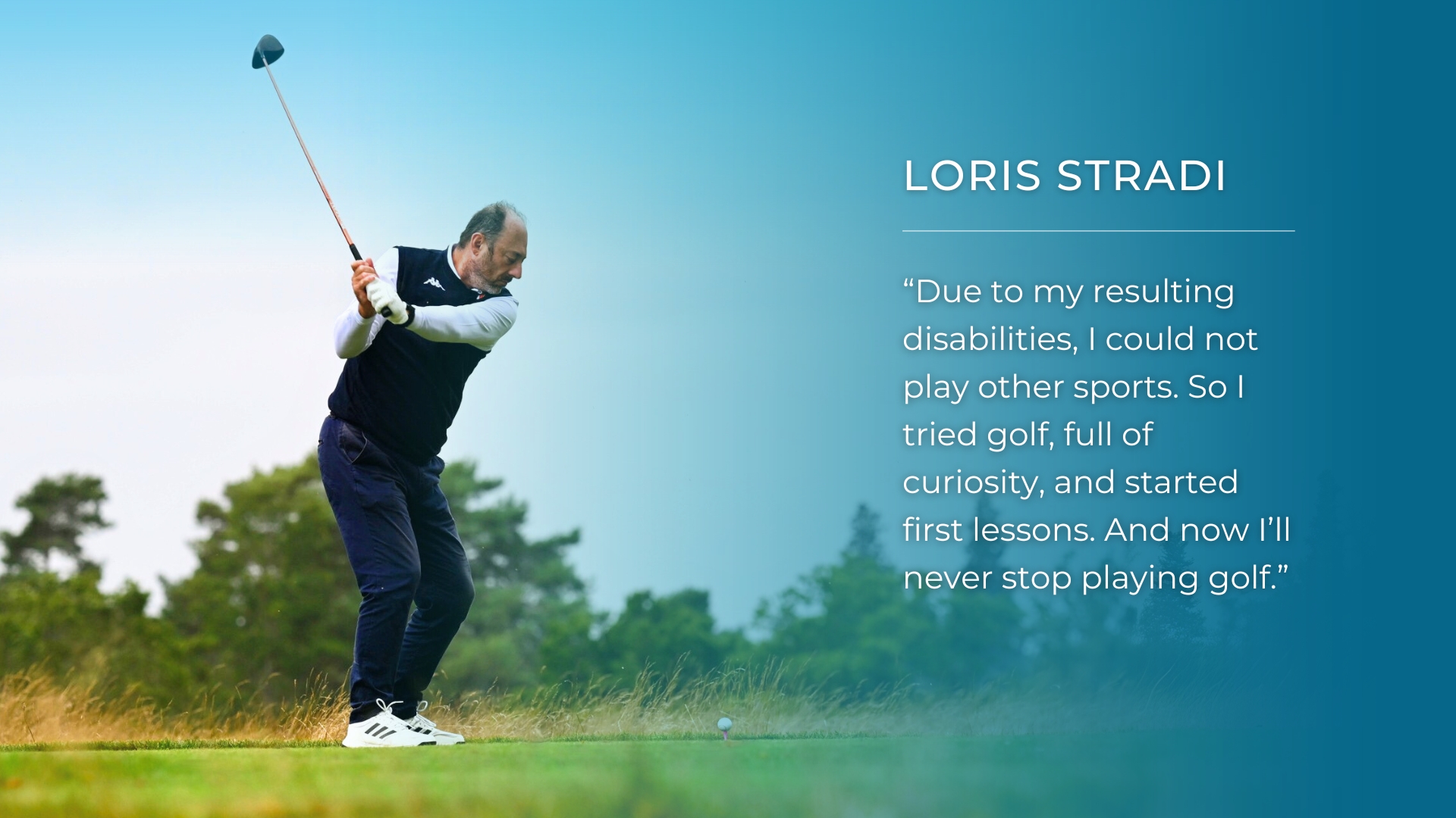 “Because of the resulting disabilities, I couldn’t play other sports. So I tried golf, full of curiosity, and started my first lessons. And now I will never stop playing golf,” says Loris who, at the time of writing, has a WHS Handicap Index of around 23.